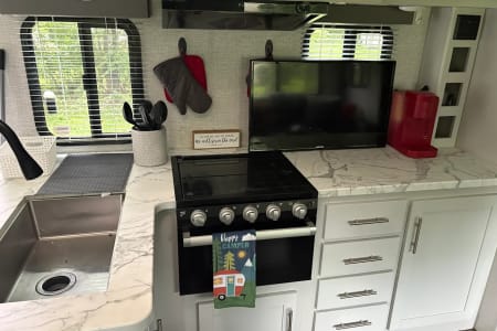 Beautiful Bonnie is the perfect place for your getaway. This RV is fully stocked with linens, cookware, dishes, Keurig coffee maker, ice maker, outdoor rug, and LED lights. Each bed has a USB plug in for all your charging needs. Bathroom is stocked with towels, washcloths, and toilet paper. We hope you enjoy relaxing time away in our RV.