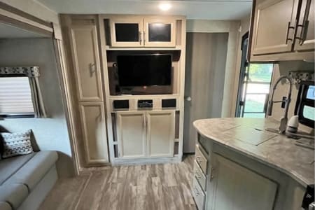 toaster *Electric grill/ spatula/ tongs *4 Outdoor folding chairs *Large outdoor rug *Mop/ broom/ dustpan/cleaning supplies if needed *Outside cooking area with sink/electric grill/refrigerator*Please read Prep Fee* My wife and I disinfect and clean the entire camper between rentals. We literally clean everything with disinfectant and clean all bedding and towels, etc. on the highest hot water setting possible, often washing everything twice.*Please make sure that the campsite you choose can fit the travel trailer (34 ft from tongue to bumper) *This trailer is a normal campsite 30 amp service although the trailer can use a 50 amp service with the adapter that's provided if needed. What's included*Master bedroom with a comfortable queen size bed *Separate large bunkhouse room - sleeps 3 *Full kitchen with large a refrigerator, stove/oven/microwave *All bedding/pillows