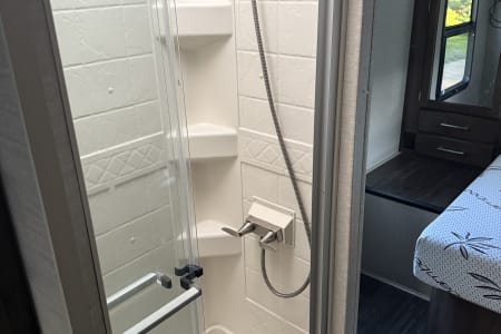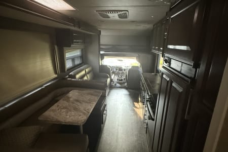 Setting up camp is quick and stress-free thanks to the automatic leveling jacks and power awning. Inside, you’ll find a full kitchen, bathroom, and entertainment system that make this coach feel more like a mobile apartment than a camper.