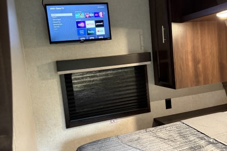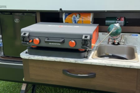 Enjoy evenings under the retractable awning with included camp chairs, LED lights, and an outdoor rug. The camper is fully stocked with linens, cookware, coffee maker, and even a s’mores kit to sweeten your stay.