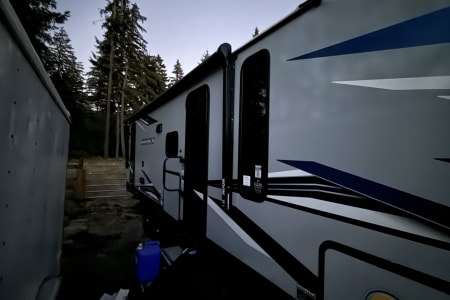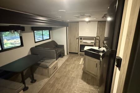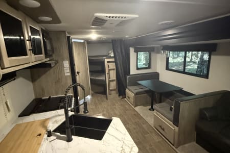 Brand new travel trailer set up for kids and infants for travel and stay. all accessories and tools included in trip. queen bed up front with table and couch, with two bunk beds in back. separate door for bathroom in back. outside table and fridge with speaker to party along with