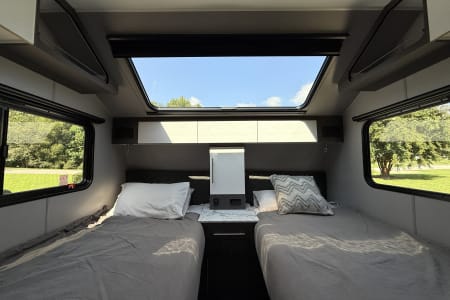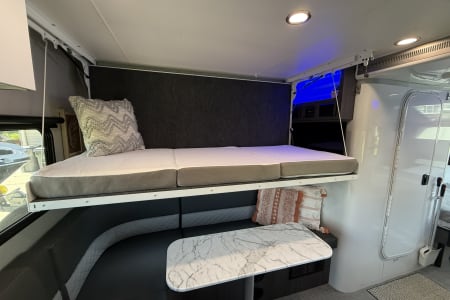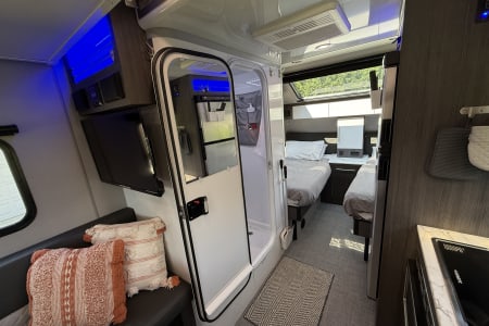 - Stowaway twin bunk with linens + pillow + blanket (175lb limit)