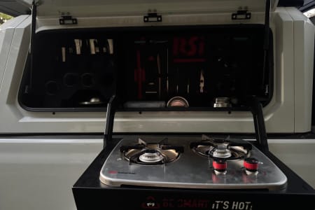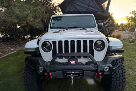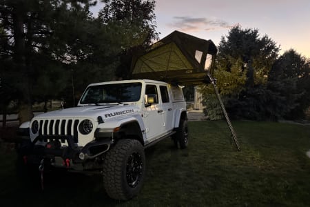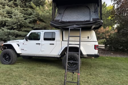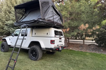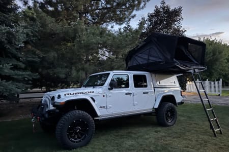Take the path less traveled with this unique rental. The 2023 Jeep Gladiator Rubicon has better clearance and larger tires than any camper van and is sure to get you to that perfect camping spot. No need to setup a tent on the ground as this rig has a rooftop tent that folds open and keeps you high up off the ground. Even though you'll be in the wild, with the included fold out camp kitchen you don't have to eat like it. Equipped with a 2 burner propane stove, with a small cutting and prepping shelf, glass tumblers and wine glasses for drinks, cooking utensils and other silverware also included. The tent is approximately the size of a king size bed and can sleep 3-4 comfortably, however if more sleeping space is needed, the truck bed can make a nice sleeping area as well, comfortably sleeping 1-2 people. Whether you just want to have the coolest camping rig at the family reunion or you want to go where nobody has gone before, this rental will not disappoint.