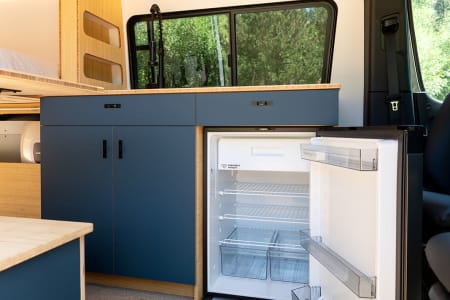 Fully Equipped Kitchen – fridge, stove, sink, and plenty of storage for cooking on the road.