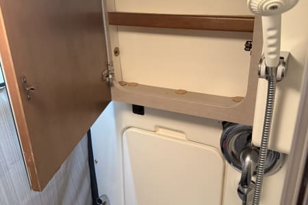 - 25 gallon fresh water tank enables you to use the full bathroom with shower, toilet, bathroom sink, vanity mirror, closet and storage drawers.