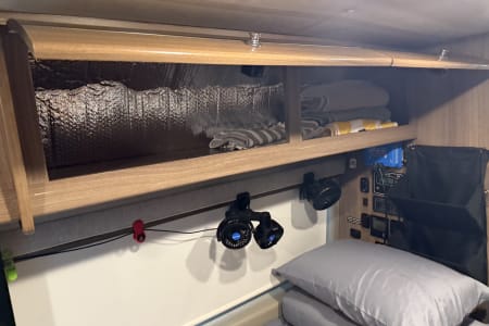 - Lithium house battery conversion with 480Ah battery capacity (you will never, ever run out of power), generates up to 500W of solar power, 50A (600W) DC-DC charging (alternator charging), 3kW inverter so you can run the overhead Coleman Mach 10 Air Conditioner off-grid.