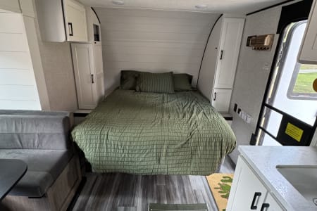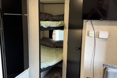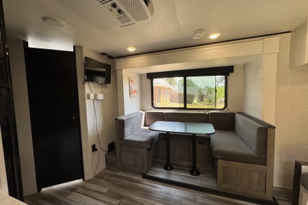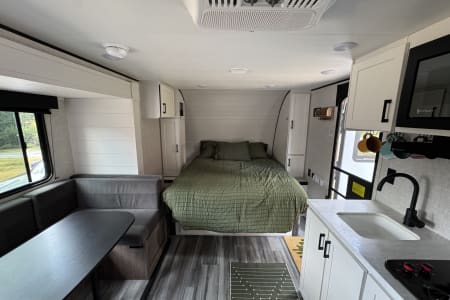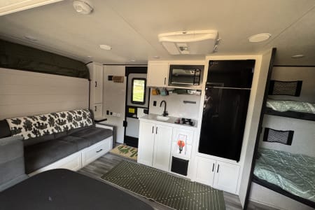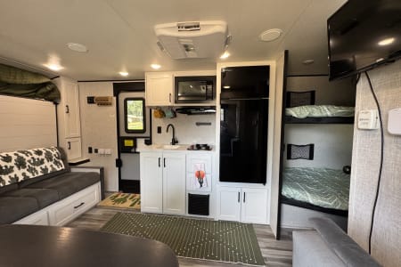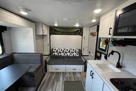 Comfortable Sleeping: Sleeps up to 8 with a queen Murphy bed, convertible U-shaped dinette, and double-over-double bunks.
