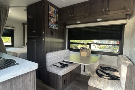 Sleeps up to 6: Rear queen bed, over-cab bunk, and convertible dinette.