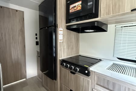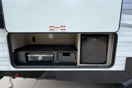 Step outside and the adventure continues with a full outdoor kitchen complete with griddle and mini fridge, a large power awning with LED lighting, and plenty of pass-through storage for camping gear. At just ~5,700 lbs dry weight with a hitch weight of about 698 lbs, it’s towable by most half-ton trucks. Whether you’re roasting marshmallows, cooking breakfast under the awning, or making memories on the road, Bunkhouse Bliss is the perfect basecamp for family fun.