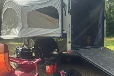 This camper is perfect for your next off-road adventure, or pull right up to your favorite campsite at your favorite campground! Big enough to fit a couple of smaller motorcycles, this camper is your solution to taking your toys places you never thought possible! This unit has two awnings (back and side/batwing) to keep you covered during any type of weather. The tip-out queen bed allows for extra room inside the camper and the slide-out kitchen will get you excited to be in the great outdoors! There is also an optional air mattress that you can use to sleep two additional people. Don't miss out on your opportunity to try out this little gem for your next trip!