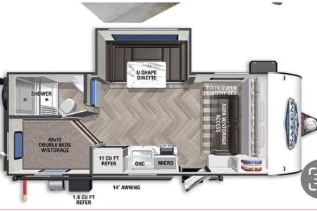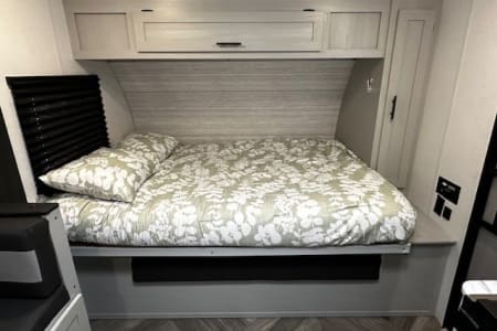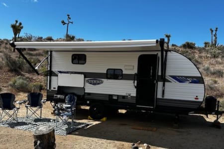 Start camping the right way in this cozy travel trailer! It features a front Murphy bed that has a queen bed to sleep on and a sofa with storage access to sit on during the day. The corner set of double bunk beds comes with storage below the bunks to keep things out of the way and is conveniently located next to the bathroom which has a shower, toilet, and sink. You can prepare your best home-cooked meals indoors with the two-burner cooktop or head to the outside LP griddle to fry up some burgers while breathing in some fresh air. Enjoy your meals, play card games, and even sleep on the U-shaped dinette slide. You will also appreciate the outside shower and the exterior front oversized door for storage access. This cozy travel trailer also has a sound system that can be accessed via Bluetooth or an aux cord. Outside there is LED lighting under the awning for the night and is used for shade during the day. This sweet home away from home is fully stocked with plates, pots, and pans, eating and cooking utensils, a Keurig coffee maker, bedding for all beds, a HUGEAR Boho Outdoor Plastic Straw Rug 6'x9' Waterproof, and towels for the shower and kitchen. The TV is mounted on the wall in the seating area and is equipped with a DVD player. We have provided some movies and games. ** Unfortunately, we are unable to deliver to Joshua Tree National Park.