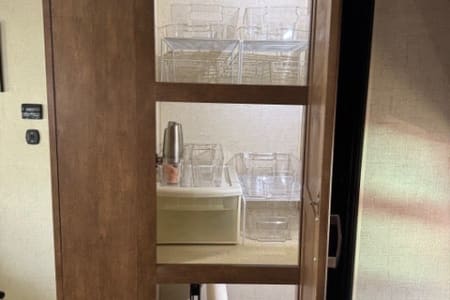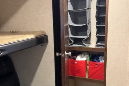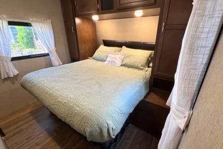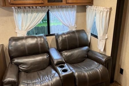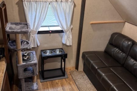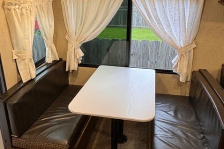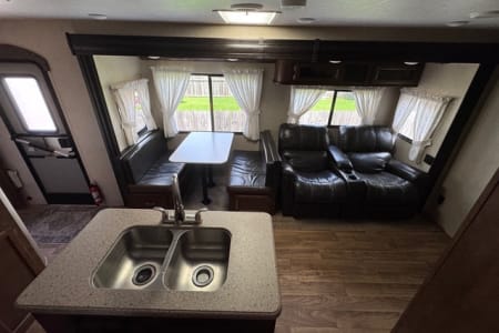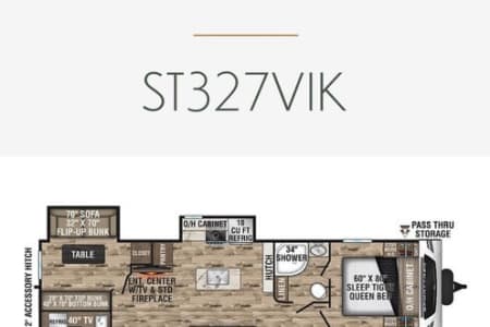 Camp in style with the fully stocked 2018 Venture SportTrek 327VIK—perfect for families or groups. This spacious travel trailer features a private master bedroom, separate bunkroom with door, cozy living area with fireplace, and a well-equipped kitchen with island and large pantry. It’s loaded with linens, dishes, cooking essentials, coffee pot, toaster, plus indoor entertainment like board and card games—and outdoor fun like cornhole and CanJam. Relax under the power awning or fire up the outdoor kitchen. Just bring your personal items—everything else is ready for your arrival.