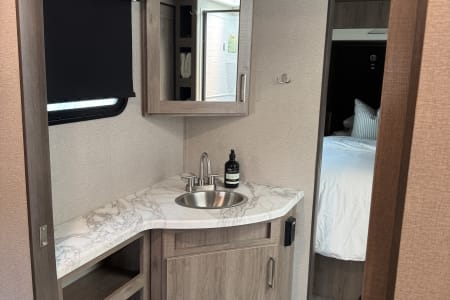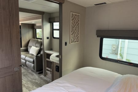 Cozy Sleeps – Queen bed with privacy doors, plus a convertible dinette for extra guests. Sleeps up to 4 comfortably. All windows have black out shades for a restful sleep!