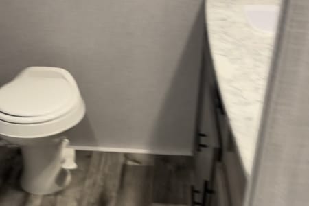 Enjoy peace and comfort away from home in the perfect space. Make memories with your family and enjoy the outside grill and fridge while you listen to your favorite football team. Play corn hole that’s hidden in the hideaway bin. You’ll find chairs there for lounging as well. Let out the 18 foot awning to enjoy the shade. Or sit inside at the perfect temp and enjoy the flames of the fireplace, while watching the best games. Behind the tv and fireplace you’ll find the perfect storage for all your game day snacks. When it’s time for bed watch tv from the comfort of your memory foam mattress. Need the rest room in the middle of the night? No worries you have the best bathroom a camper can offer. Spacious with double sinks. No arguing about who’s brushing their teeth first in the morning.