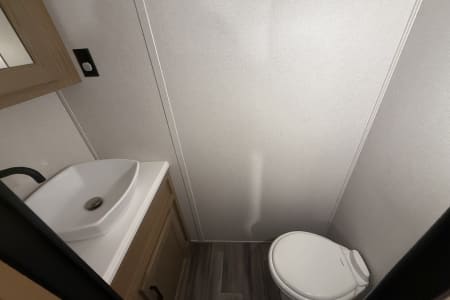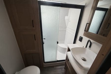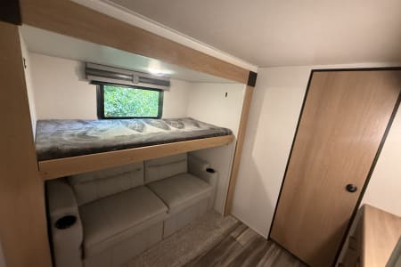 This fifth wheel has plenty of room for the whole family or friends to join in on the fun! Your guests will have the mid-bunk room all to themselves with a jackknife sofa and a flip-up bunk above, a dresser for their clothes, and a convenient half bath. The loft with a 60" x 80" bunk mat is sure to be a fun addition for the kids, and you and your spouse will enjoy the front private bedroom with a king bed slide for your comfort. Everyone can meet in the rear living area that includes an EZ glide couch, 65" theater seating, and a legless dinette for game night. The chef of the family will have plenty of counter space for prepping meals on the island peninsula, and the four burner cooktop can heat up any casseroles they have prepared. If the weather is nice, you may just want to head outdoors to cook dinner on the outside grill, and the two electric awnings with LED lights will provide protection from the sun rays!