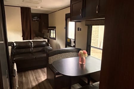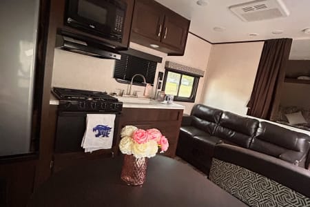 The central kitchen is fully equipped with a 3-burner range, oven, microwave and mid-size refrigerator, making it easy to cook your favorite meals on the go. A spacious bathroom with tub/shower combo and vanity sink ensures everyone has the comforts of home.