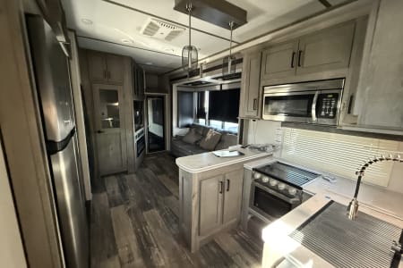 Luxury living space with recliners, fireplace, big TV, & full kitchen