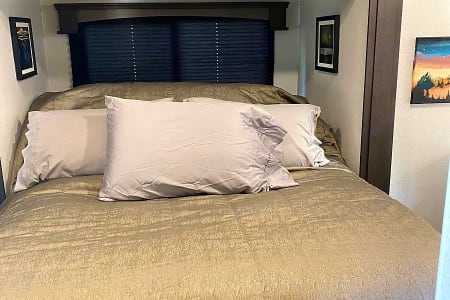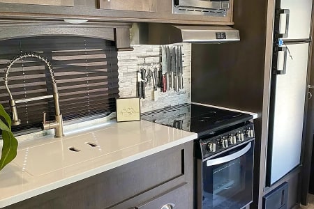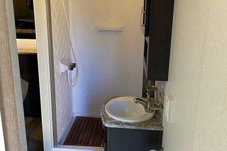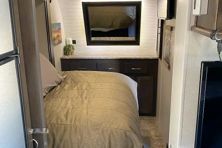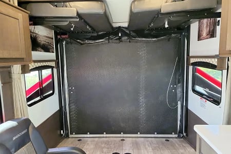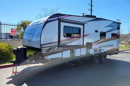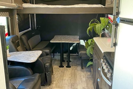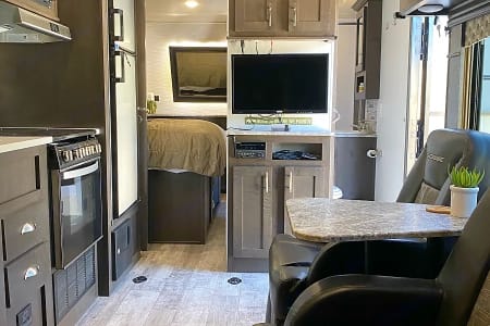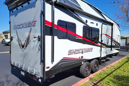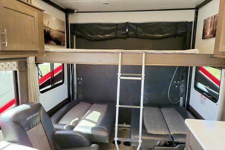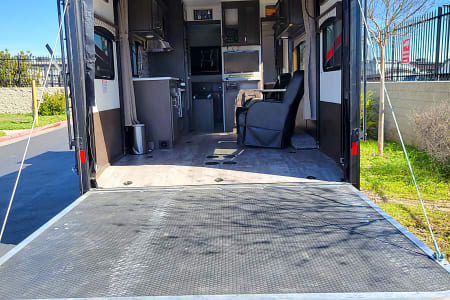 Toy hauler travel trailer with sleeping for up to 6, featuring a private bedroom, convertible seating, and garage space for ATVs or bikes. Includes a full kitchen, bathroom, and slide-out for extra living space.
