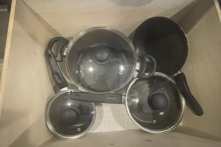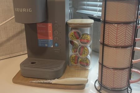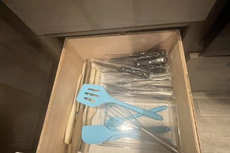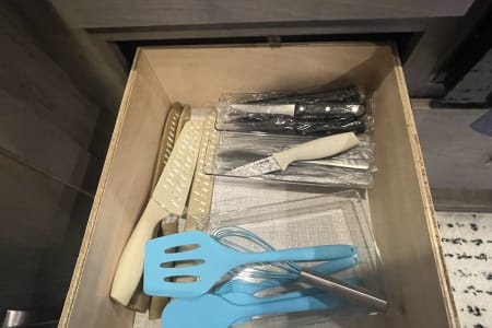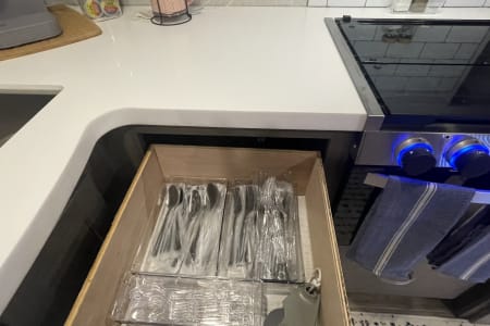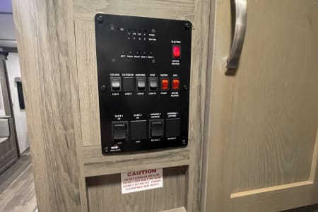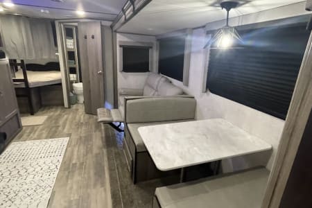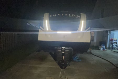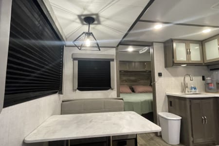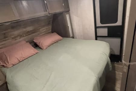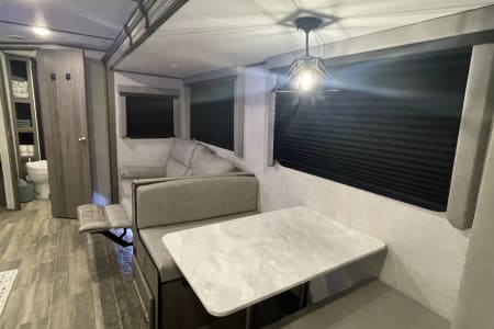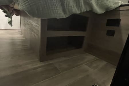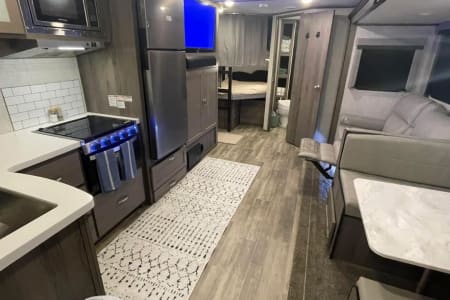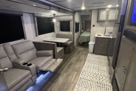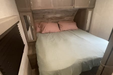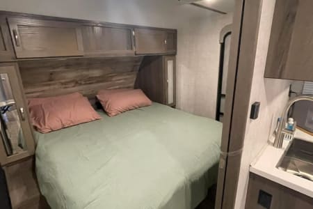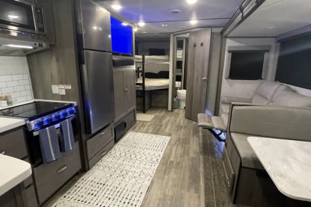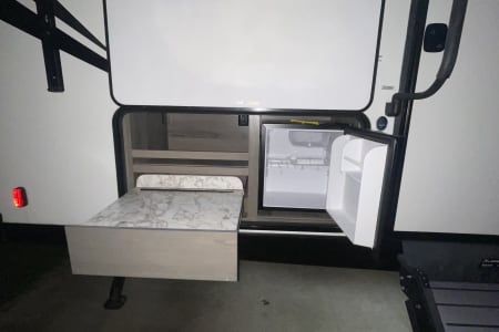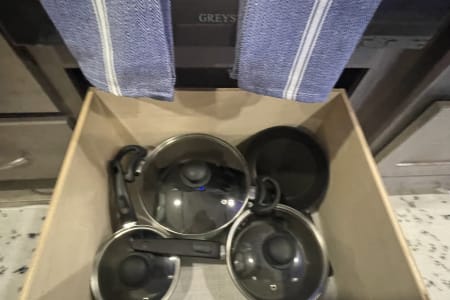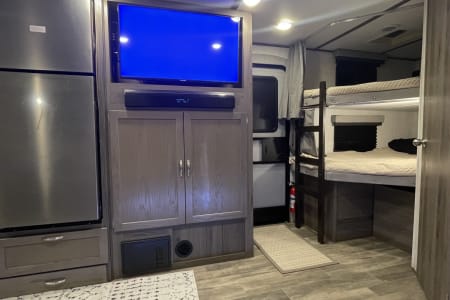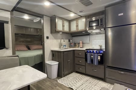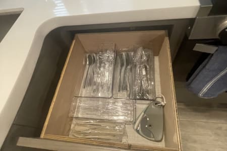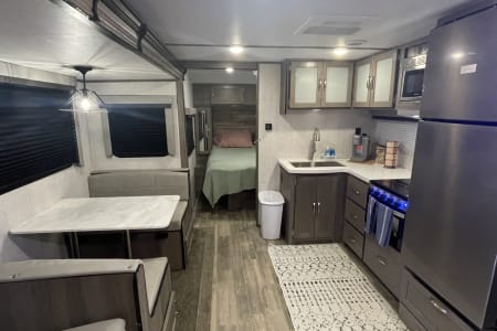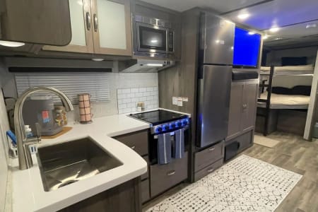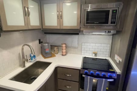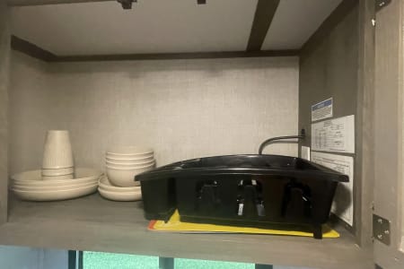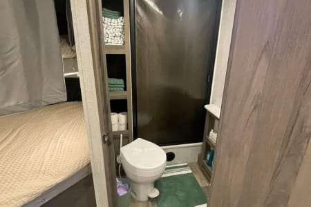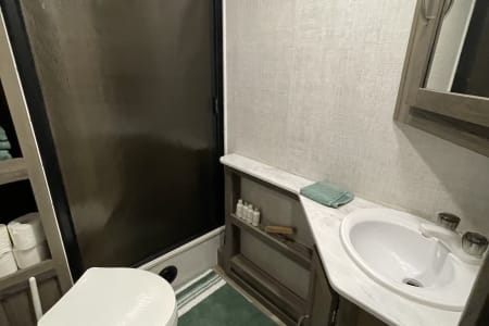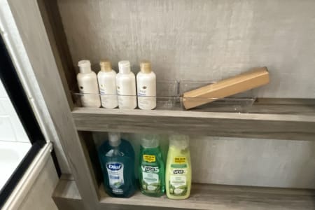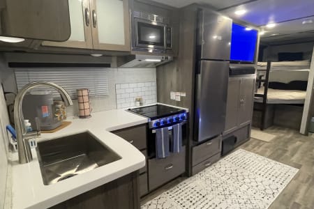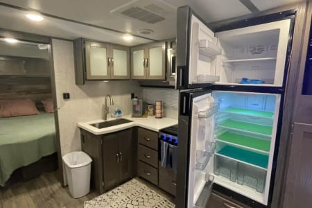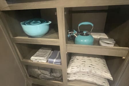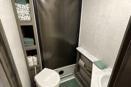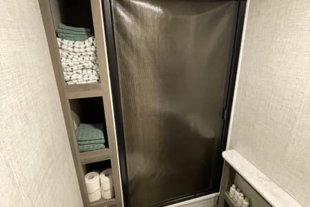 RV is stocked with everything you need for cooking, bedding, bathing (except some personal hygiene items), Keurig coffee maker, Turkish or bamboo towels, nice quality cookware, utensils, dishes, knives, and many extras, by request, like an air fryer, instapot, snow cone machine, blender, margarita machine, jand many other options available to add. Just ask! Very nice shower with sliding door for complete privacy. It has a huge pantry, shoe storage and even a drawer for pets water bowl built in! Indoor sound bar, full size upgraded sink faucet, appliances still have plastic on them! We just bought this RV. It’s like new!