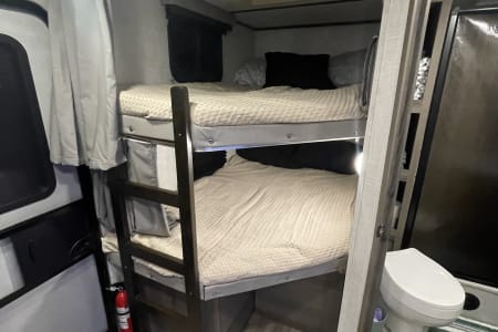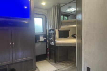 Bunk room as (2) Full size beds with privacy curtains, personal light and usb plugs. Located between bathroom and living room with 2nd door to outside between.