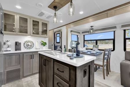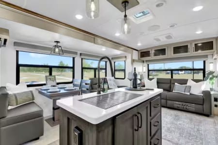 Unwind in the inviting rear living area, featuring a comfortable 76" hide-a-bed sofa and cozy 60" theater seating, all centered around an entertainment center complete with a fireplace and smart TV. Meal prepping is a breeze with the well-equipped kitchen with an island, and the comfortable booth dinette is perfect for enjoying meals together.