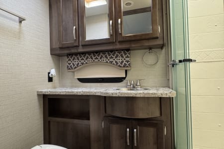 Forget the tiny “closet bathrooms” in most campers. The full-wall slide allows for a larger bathroom, giving you space to actually move around. Hot showers, functional storage, and a real sense of convenience mean you won’t be “camping,” you’ll be living.