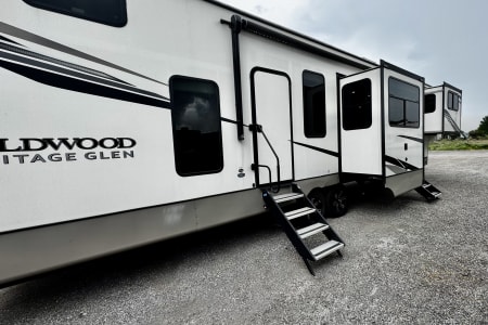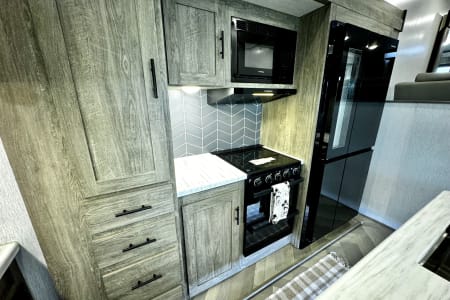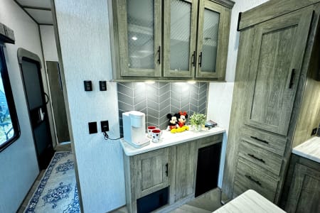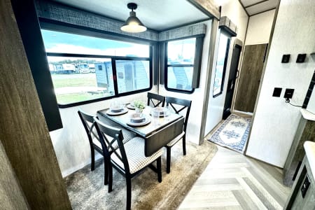 Kitchen - Located centrally, the kitchen boasts dual slides for excellent space efficiency, Includes a kitchen island, free-standing table and chairs, and a hutch for additional storage.