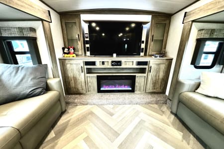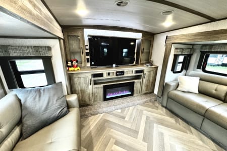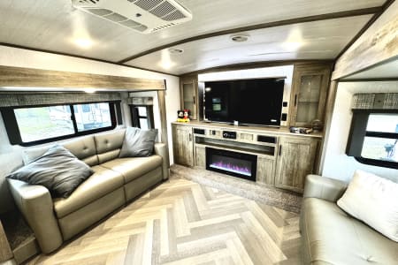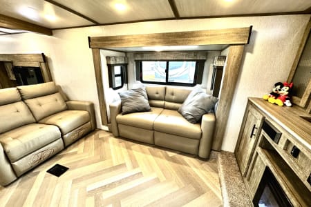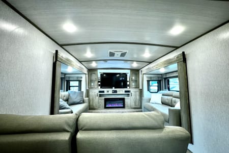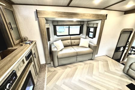 Living - Features a separate front living room with two opposing tri-fold sofas and a reclining sofa equipped with cupholders.