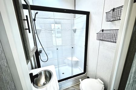 Bathroom - Centrally located bathroom includes a residential-style walk-in shower, Offers full amenities like a toilet, sink, mirrored medicine cabinet, and vent—built for comfort.