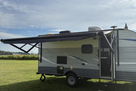 Camp chairs are provided for your comfort while sitting under the spacious awning.
