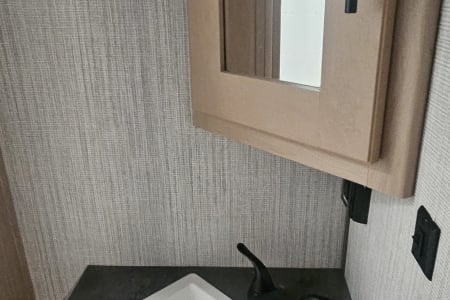 I’ve got a full bathroom with a shower and toilet, a kitchen inside with a 3‑burner stove, oven, microwave, and mid‑size fridge, plus plenty of counter space for cooking up your favorites. Want to take the party outside? I’ve got a 19' power awning for shade and shelter, and loads of pass‑through storage for all your gear—chairs, fishing poles, bikes, you name it.
