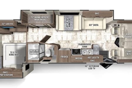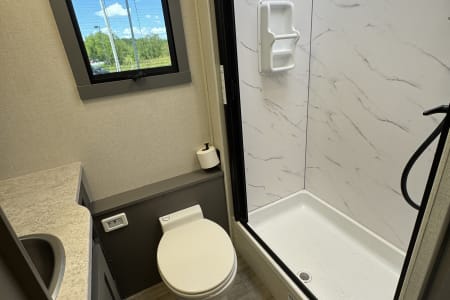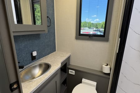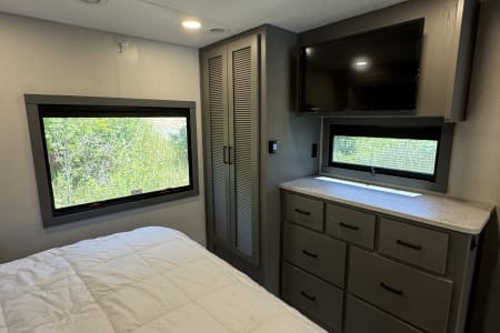 I’ve got a full bathroom with a shower and skylight, a kitchen with a 3‑burner stove, oven, microwave, and full‑size fridge, plus plenty of counter space for cooking up your favorites. Want to relax after a day of exploring? I’ve got three TVs—one in the living area, one in the bedroom, and even one outside under my 17' power awning for movie nights or game days under the stars.