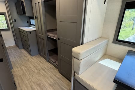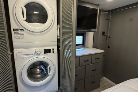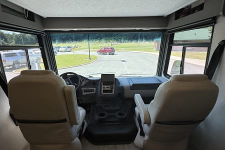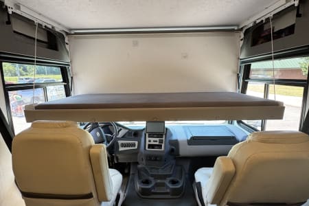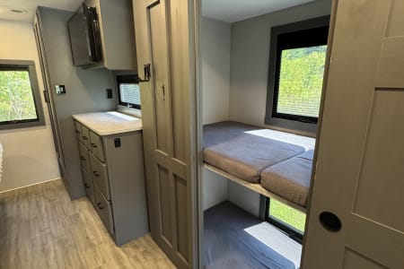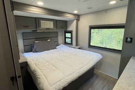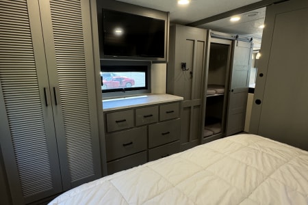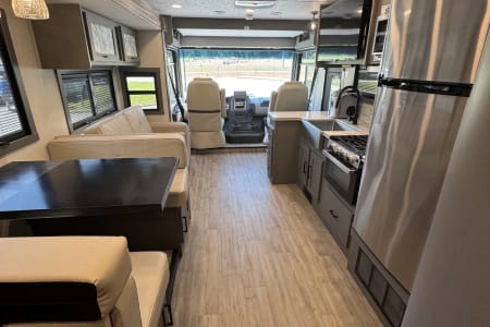 Hi everyone! I’m a 2025 class A, and I’m ready to take you, your family, and your friends on the road trip of a lifetime! I’ve got a private king bedroom in the back, a drop‑down overhead bunk up front, a versatile bunk/office/wardrobe space, a comfy sofa that turns into a bed, and a booth dinette that also converts—so I can sleep up to 9 happy travelers!