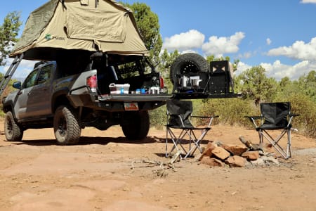 With a rooftop tent that sets up in minutes and a swing gate complete with water jug holders and a fold down table you can transition from road to camp without missing a beat. The Kings Offroad suspension and C4 body armor make rough trails easy while the lockable rear differential and 4 wheel drive ensure you can reach camping spots most vehicles simply cannot.