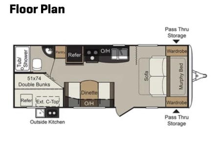 This trailer features a Queen Murphy bed, comfy sofa, double bunk beds, a booth dinette, a full bath, and an outside kitchen, designed for compact travel and family fun.