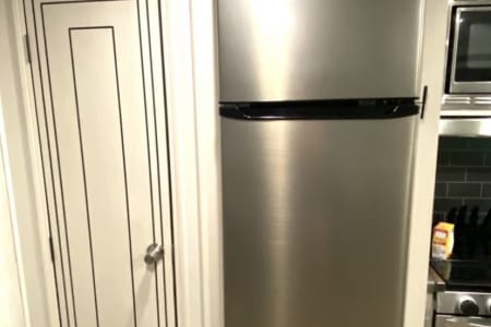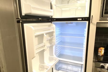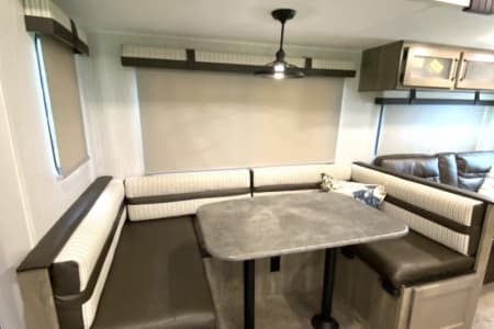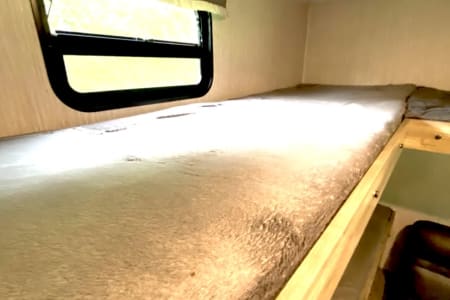 The rear bunkhouse makes this model especially family-oriented, featuring double bunks and a small seating area/sofa that converts to additional sleeping space. Across from the bunks, there’s storage space for clothes, games, or gear.