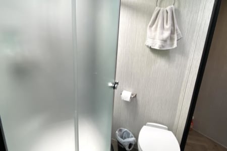 The bathroom is centrally located with a shower, vanity, toilet, and direct outdoor access, which is a big plus when camping with kids—no need to track through the whole trailer after playing outside.