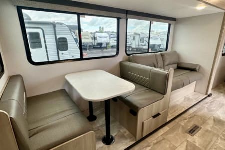 The living area includes a fireplace, slide-out for extra space, and seating that converts into additional sleeping spots (dinette and sofa). The fully stocked kitchen and bathroom come ready with essentials, and beds include pillows and sheets for a hassle-free stay.