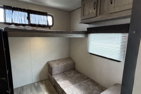 Bunkroom with large, comfortable bunks and a nugget couch so the kids have their own space
