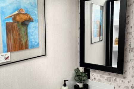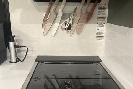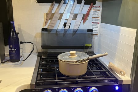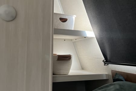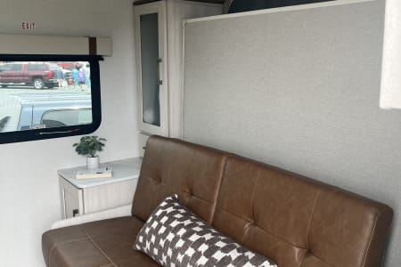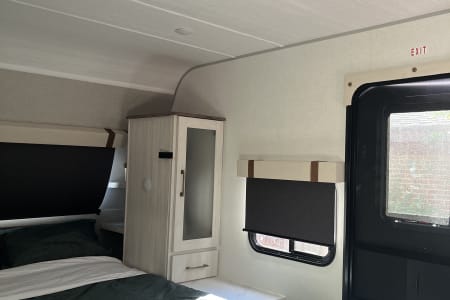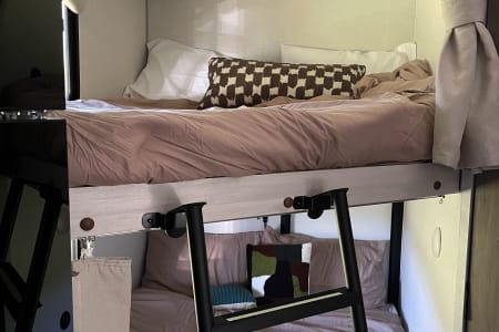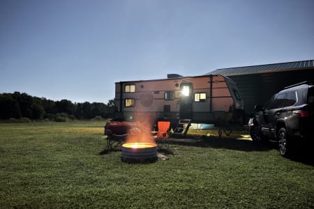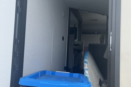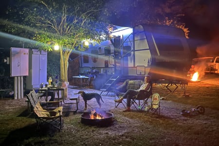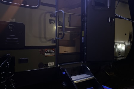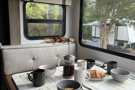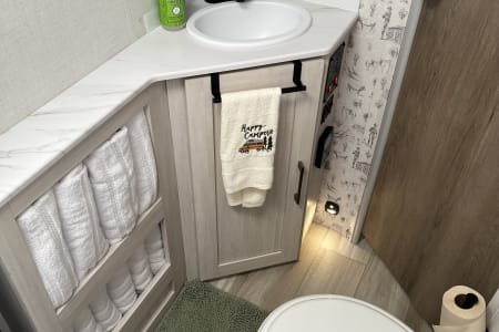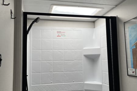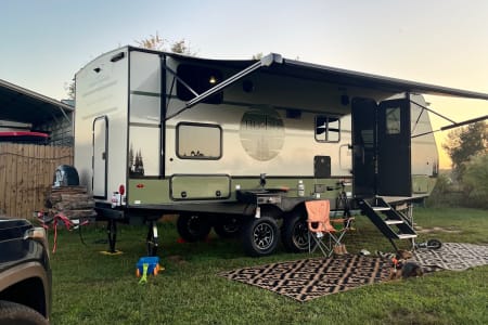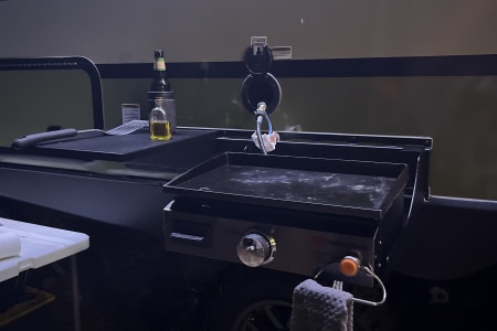 Rainy day? We’ve got board games to keep everyone entertained. Sunny skies? Relax outdoors with the outdoor kitchen, large awning, camping chairs, rug, and lawn games — perfect for soaking up the fresh air. There’s also an outdoor shower and griddle with propane hookups for easy cooking and cleanup.