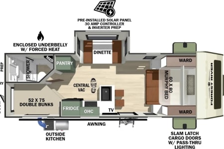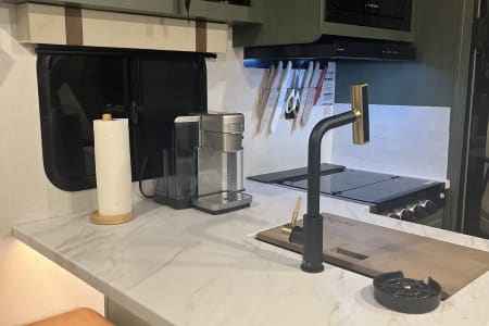 Inside, enjoy thoughtful touches like a Murphy bed, spacious bunks, and a sliding dinette that converts for extra sleeping space. The kitchen has everything you need — a 3-burner stove, large fridge and freezer, Keurig coffee machine, and a farmhouse-style sink with built-in cup washer.