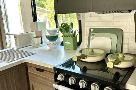 Fully equipped kitchen – Ample count space, Refrigerator/Freezer, 3-burner cooktop, oven, microwave, toaster, deep sink, cookware, dishes, utensils, coffee maker for your morning fuel.