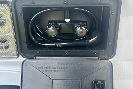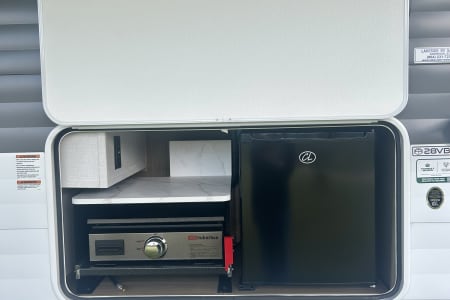 Outdoor living – 16’ power awning, outdoor kitchen with propane grill, mini refrigerator and camp chairs included for cozy nights under the stars.