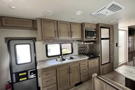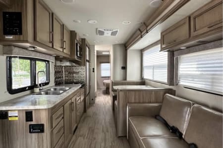 Travel in comfort and style with our Entegra Odyssey 29V Class C RV, perfect for up to 8 people. Enjoy a queen bed, bunk over the cab, full kitchen, bathroom with indoor and outside shower, and a spacious slide-out living area. With air conditioning, TV, generator, and plenty of storage, this RV makes family adventures or road trips effortless and fun!