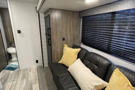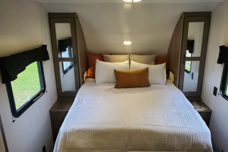The shower is full size and has a round bar to allow more space. Bathroom is also full size! Plenty of storage. The Kitchen has a convection Stove/Oven, microwave, full size- 2 compartment sink and comes with everything you need to cook except the food! Theres even an outdoor kitchen with a griddle and mini fridge that is great for making the bacon, or your breakfast of choice. It has 2 propane tanks for longer reservations. 30 Amp hookup or rent our 30 amp gas powered generator to go off the grid. We also have Starlink available for internet anywhere!