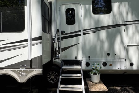 Enjoy this beautiful 42 ft Fifth Wheel with Residential features! RV rental and delivery for our fully stocked, 42ft fifth wheel and stay at a beautiful campground! With homelike amenities and features, a couple and their cherished pet or a small family will love camping in this rig. You can rent this RV and pull it yourself to wherever you want to go, or I can drop it off and set it up for you at any campground you desire. It comfortably sleeps 2 with a queen size mattress, but can sleep an additional 2 on an air mattress in the open living room area. It has 1.5 bathrooms, 2 TVs inside and a TV outside for your enjoyment. Bright, exterior LED lights. Two Air Conditioners that keep you very comfortable, one exclusively for the master bedroom. We traveled the country in this rig and want to offer the same freedom to others! Come and enjoy this beautiful RV!