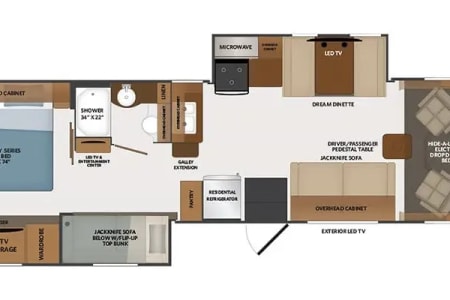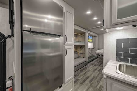 Ample Sleeping Space: Comfortably sleeps up to 8 with a king bed, overhead loft, two twin “bunkhouse” beds, and both a dinette and sofa that convert into a bed!