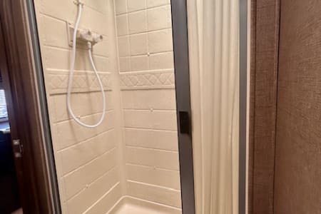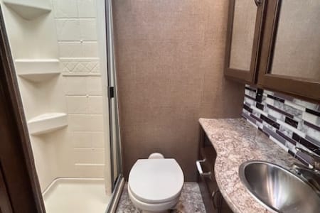 The fully equipped kitchen includes a three-burner stove, oven, microwave, and large refrigerator—everything you need to make meals on the road. The full bathroom features a spacious shower and plenty of storage, making it ideal for extended trips.