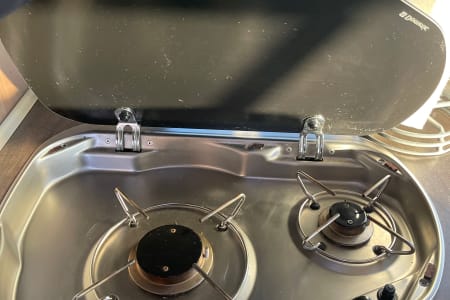 Kitchen Convenience: Double stainless steel kitchen sink with covers, a 2-burner range top with glass cover, microwave oven, and a mid-size electric/propane refrigerator.