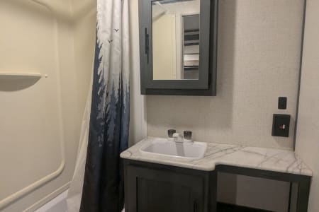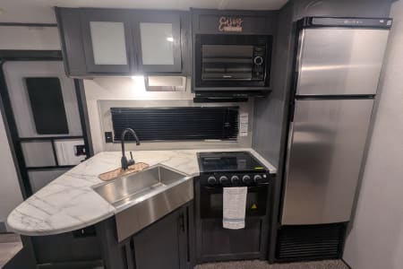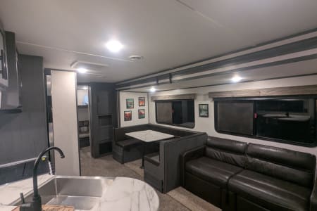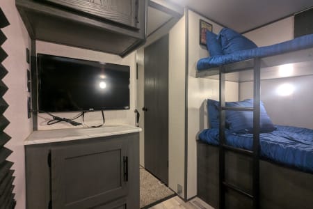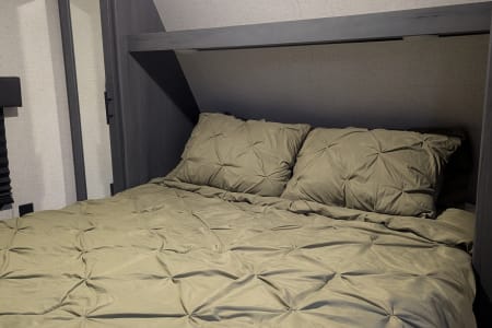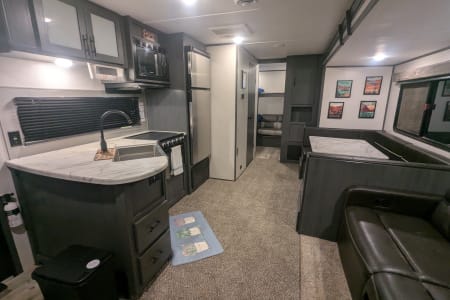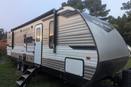 Looking to camp with privacy and plenty of space? Look no further! Inside you'll find a beautiful kitchen and living room with an extra large slide, plus two bedrooms! There is enough sleeping space for 8 (sleeps 5 adults comfortably). Delivery available.